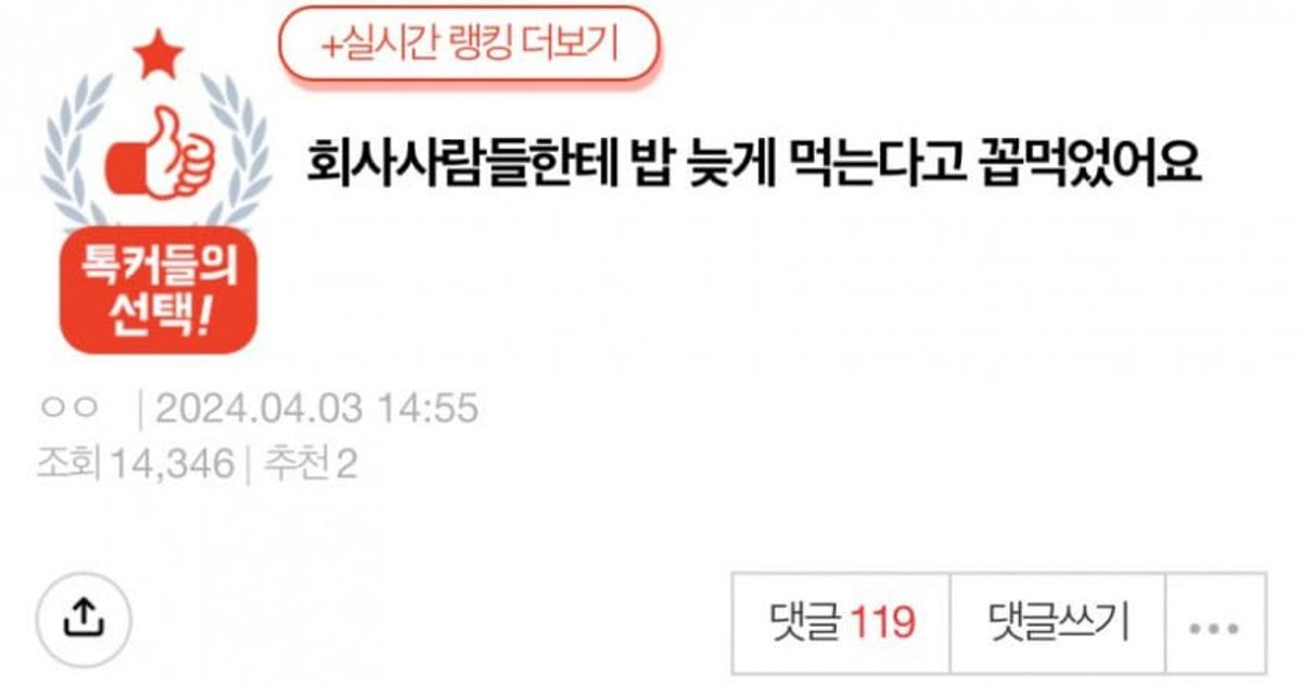 회사 사람들한테 밥 늦게 먹는다고 꼽먹었어요..